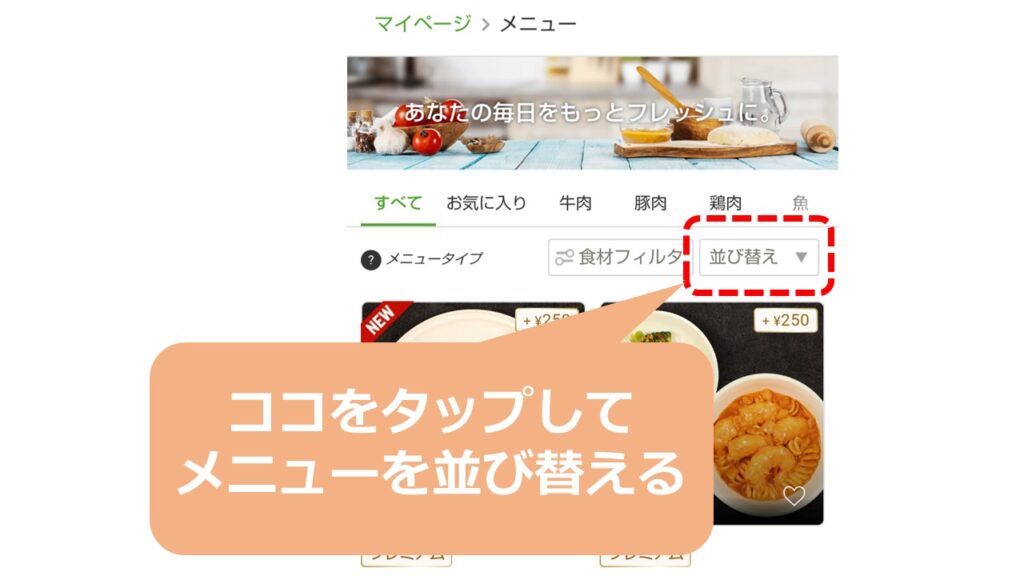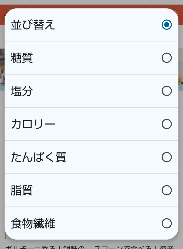右上に、料理の並び順を変えるためのメニューがあります。